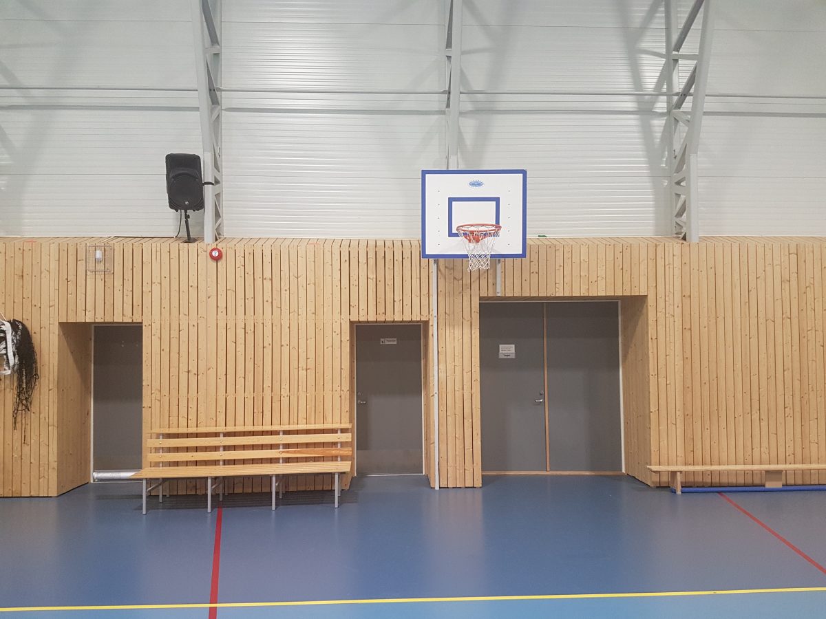Garderober, brusere, volleyballudstyr, håndboldmål 4 stk, baseballkurve 4 stk.
