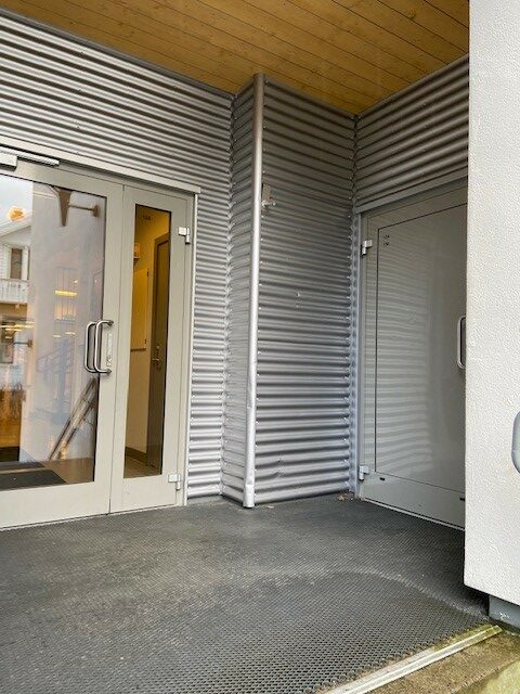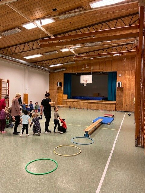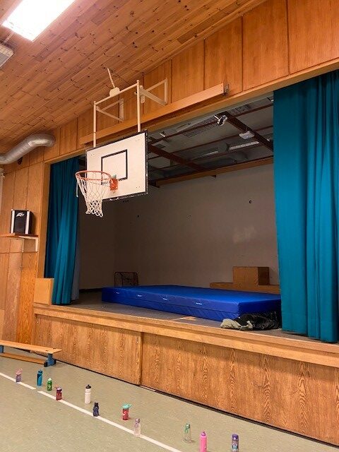 2 basketball hoops, volleyball net, ribbed walls, benches, thickets, barriers, 2 floorball goals.