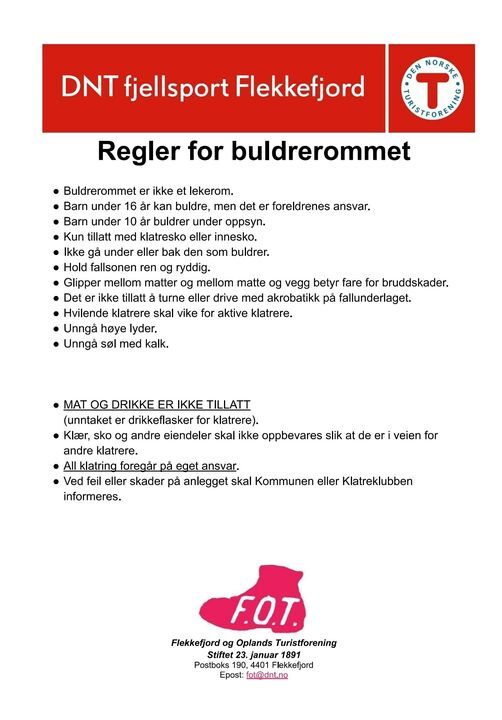 För att boka Buldrerommet för första gången måste du ha läst och undertecknat handlingarna i denna annons och skickat dem till Lene.Kristine.Rorvik@flekkefjord.kommune.no. Då kan vi ordna en tid där du kan få en nyckelbricka som kan hämtas på Flekkefjord kulturcenter SPIRA.